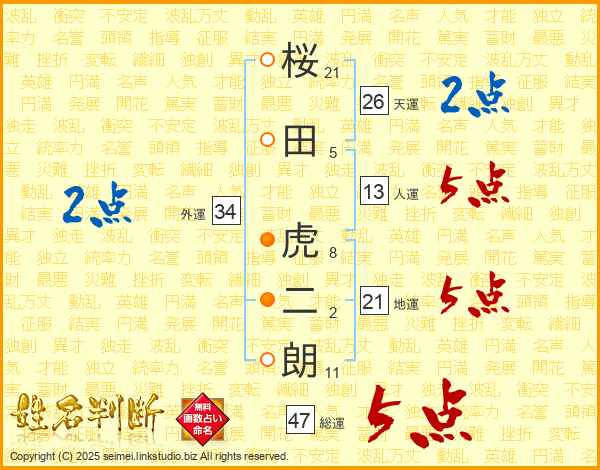 桜(21画)田(5画) 虎(8画)二(2画)朗(11画)