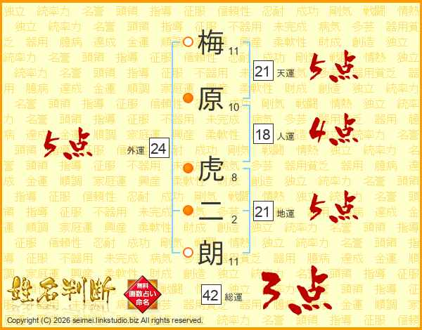 梅(11画)原(10画) 虎(8画)二(2画)朗(11画)