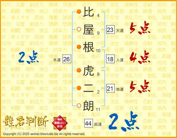 比屋根虎二朗さんの総運は44画の2点!