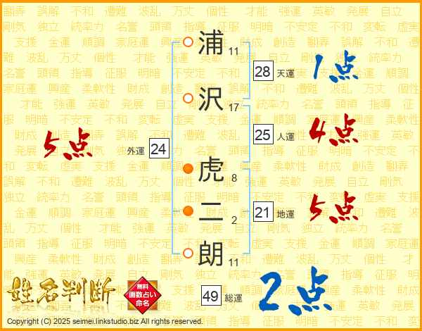 浦(11画)沢(17画) 虎(8画)二(2画)朗(11画)