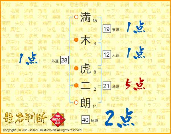 満(15画)木(4画) 虎(8画)二(2画)朗(11画)