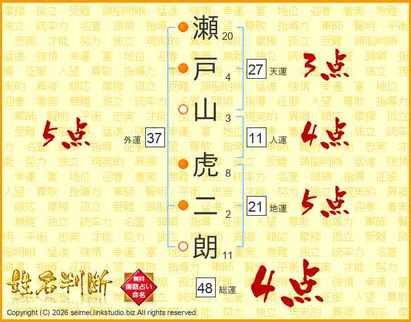 瀬(20画)戸(4画)山(3画) 虎(8画)二(2画)朗(11画)