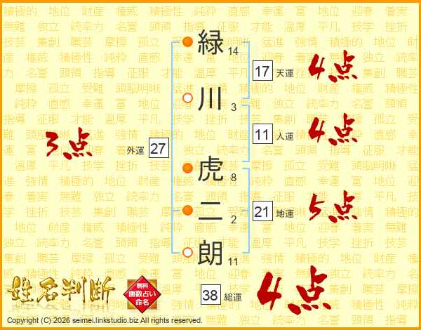 緑(14画)川(3画) 虎(8画)二(2画)朗(11画)