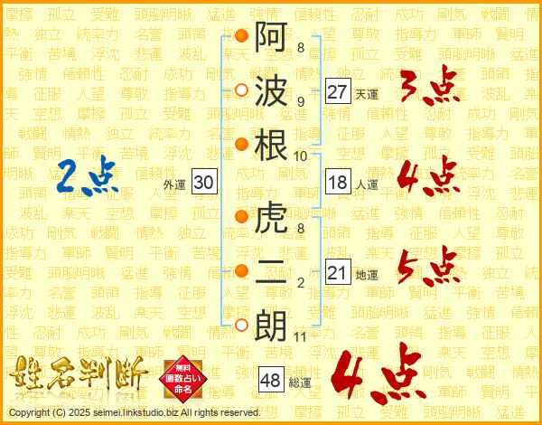 あなたの人生を表す1番重要な運勢です。生涯を通じて影響する総合運となり、主に50歳以降の晩年期に影響を及ぼします。苗字と名前の合計画数。