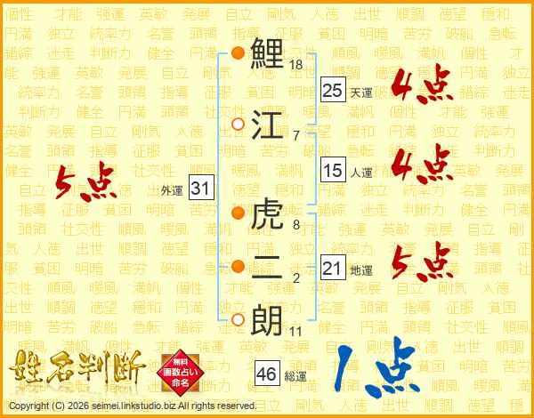 鯉(18画)江(7画) 虎(8画)二(2画)朗(11画)