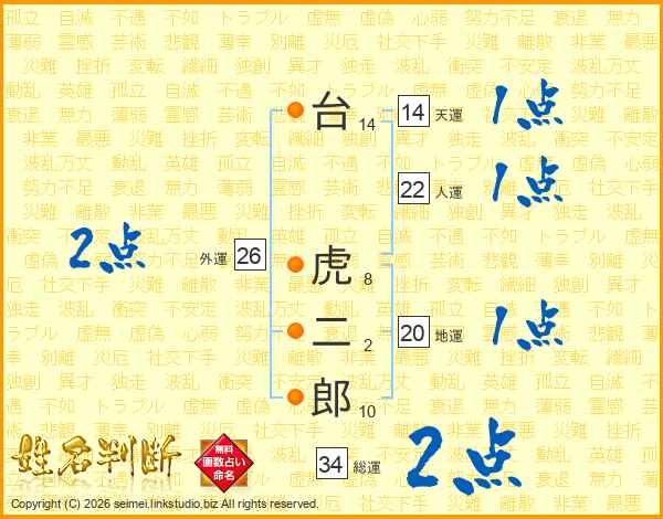 生活面を象徴する運勢です。外部から受ける影響力を表し、結婚運、家庭運や職場、環境への順応性を表します。総運から人運を引いた画数。姓や名が1文字の場合を除く。
