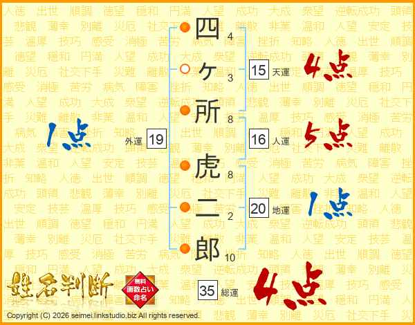 四(4画)ヶ(3画)所(8画) 虎(8画)二(2画)郎(10画)
