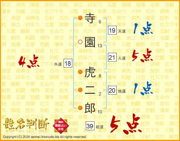 寺(6画)園(13画) 虎(8画)二(2画)郎(10画)