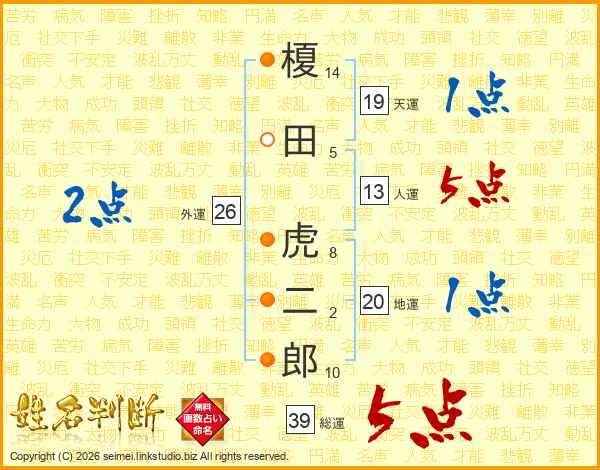 榎(14画)田(5画) 虎(8画)二(2画)郎(10画)