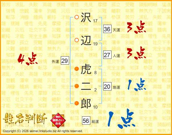 沢(17画)辺(19画) 虎(8画)二(2画)郎(10画)