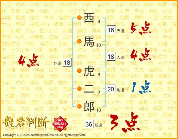 西(6画)馬(10画) 虎(8画)二(2画)郎(10画)