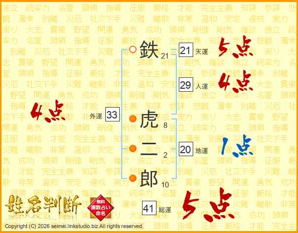 鉄(21画) 虎(8画)二(2画)郎(10画)