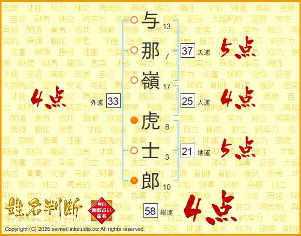 与(13画)那(7画)嶺(17画) 虎(8画)士(3画)郎(10画)