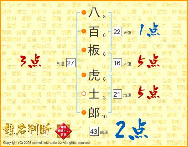 八(8画)百(6画)板(8画) 虎(8画)士(3画)郎(10画)