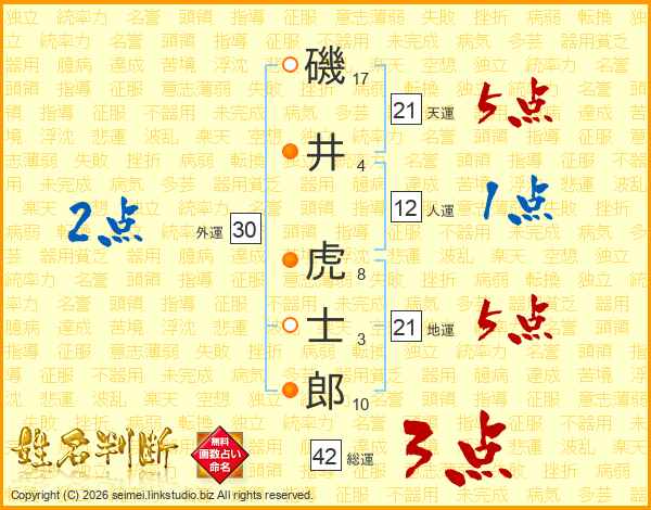 磯井虎士郎さんの天運は21画の5点!