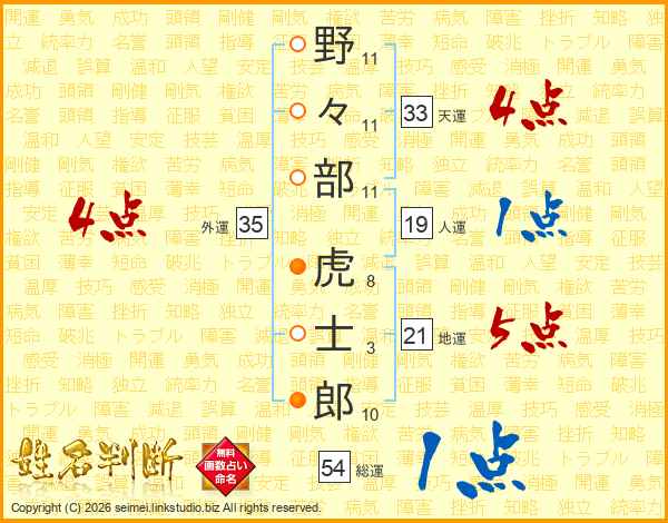 野(11画)々(11画)部(11画) 虎(8画)士(3画)郎(10画)