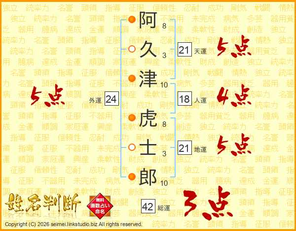 阿(8画)久(3画)津(10画) 虎(8画)士(3画)郎(10画)