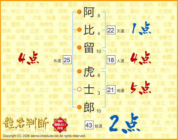 阿比留虎士郎さんの総運は43画の2点!