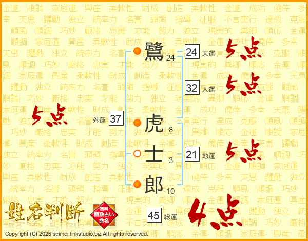 鷺(24画) 虎(8画)士(3画)郎(10画)