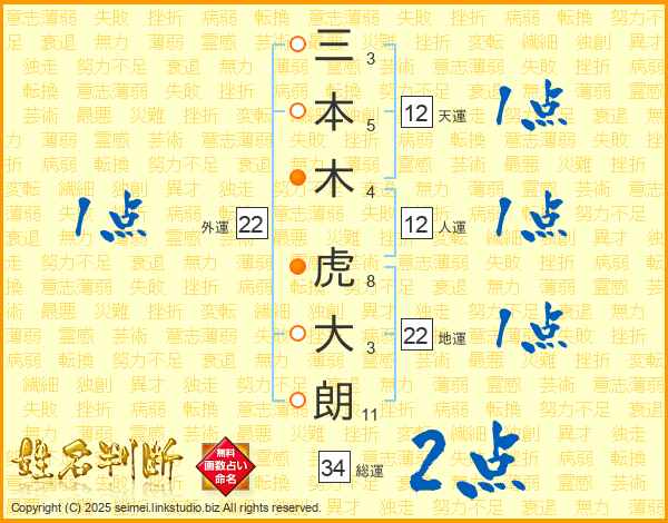 三(3画)本(5画)木(4画) 虎(8画)大(3画)朗(11画)