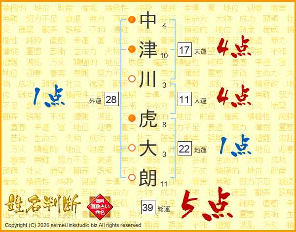 中津川虎大朗さんの総運は39画の5点!