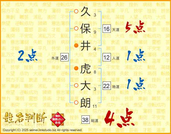 久(3画)保(9画)井(4画) 虎(8画)大(3画)朗(11画)