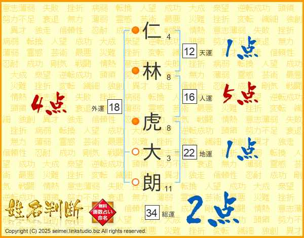 仁(4画)林(8画) 虎(8画)大(3画)朗(11画)