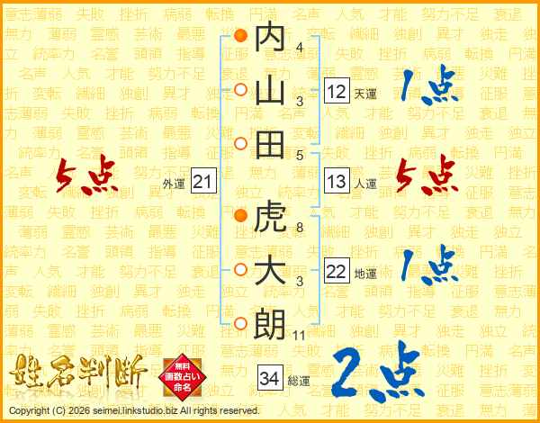 内(4画)山(3画)田(5画) 虎(8画)大(3画)朗(11画)