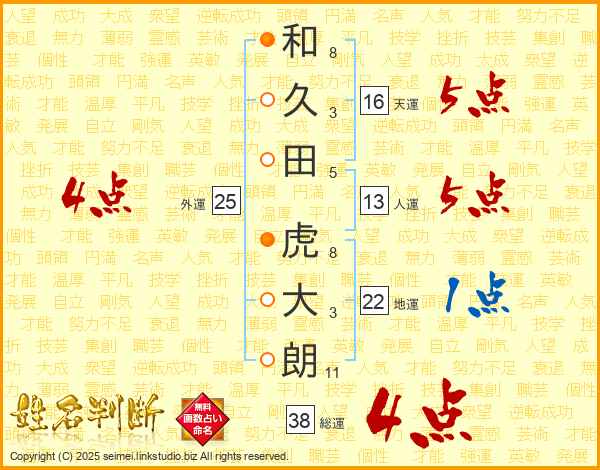 和(8画)久(3画)田(5画) 虎(8画)大(3画)朗(11画)
