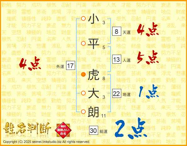 生活面を象徴する運勢です。外部から受ける影響力を表し、結婚運、家庭運や職場、環境への順応性を表します。総運から人運を引いた画数。姓や名が1文字の場合を除く。