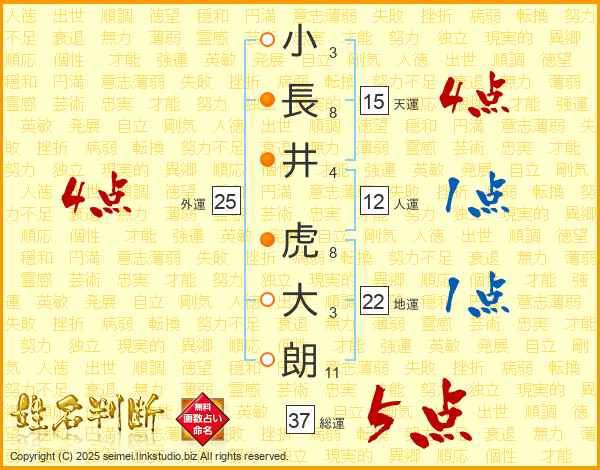 小(3画)長(8画)井(4画) 虎(8画)大(3画)朗(11画)