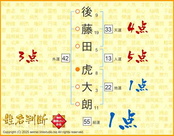 後(9画)藤(19画)田(5画) 虎(8画)大(3画)朗(11画)