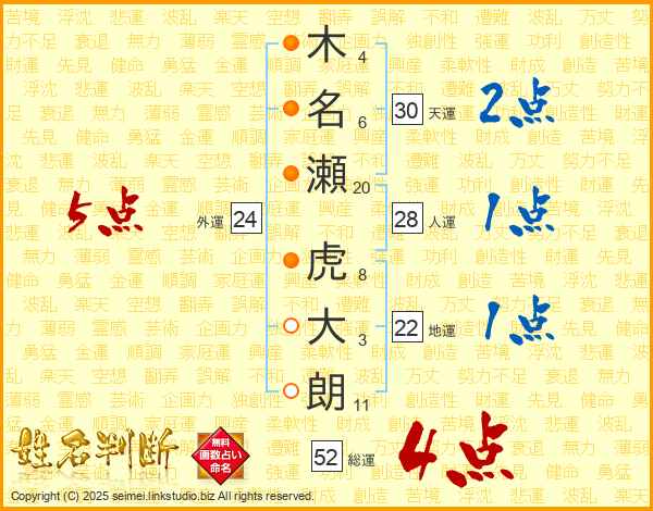 木(4画)名(6画)瀬(20画) 虎(8画)大(3画)朗(11画)