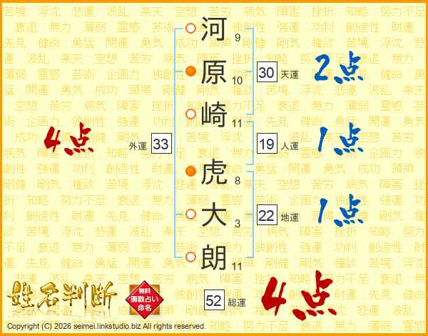 河(9画)原(10画)崎(11画) 虎(8画)大(3画)朗(11画)