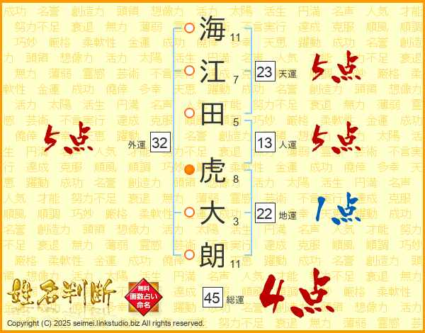 海(11画)江(7画)田(5画) 虎(8画)大(3画)朗(11画)