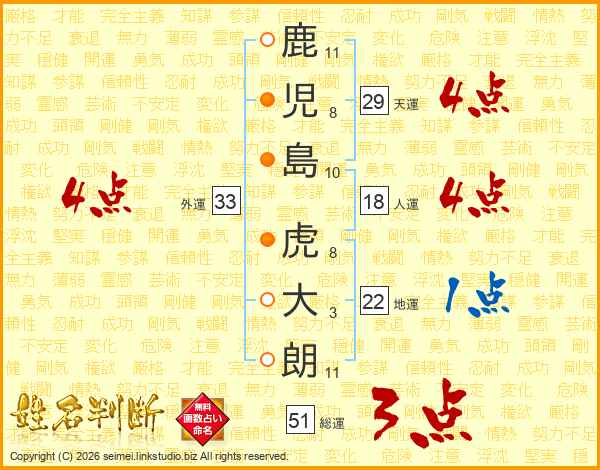 鹿(11画)児(8画)島(10画) 虎(8画)大(3画)朗(11画)