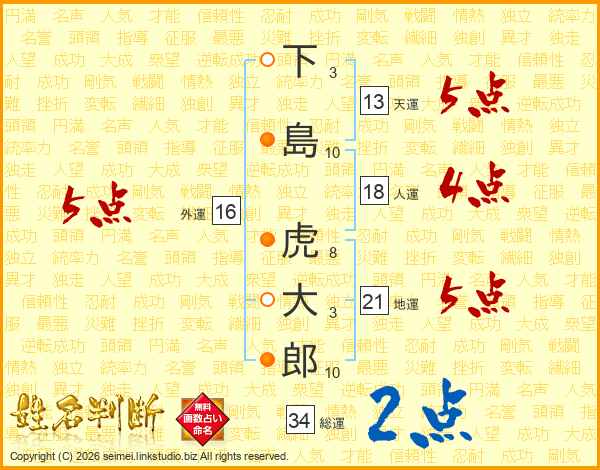 下(3画)島(10画) 虎(8画)大(3画)郎(10画)