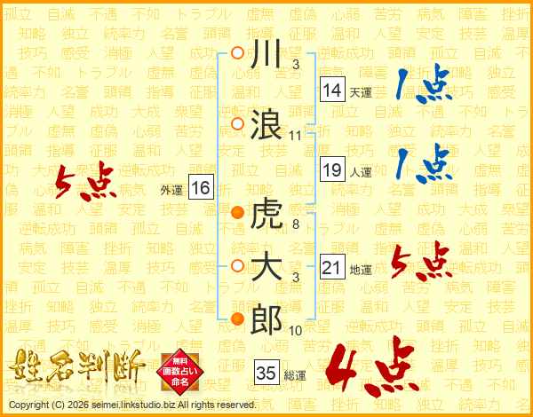 川(3画)浪(11画) 虎(8画)大(3画)郎(10画)