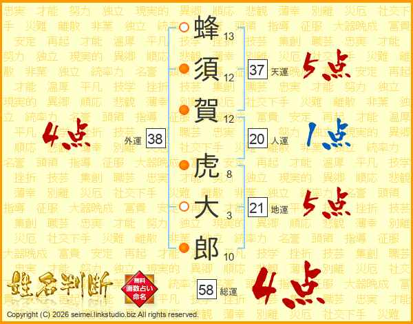 蜂須賀虎大郎さんの総運は58画の4点!