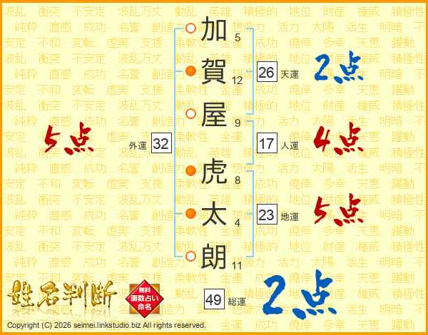 加(5画)賀(12画)屋(9画) 虎(8画)太(4画)朗(11画)