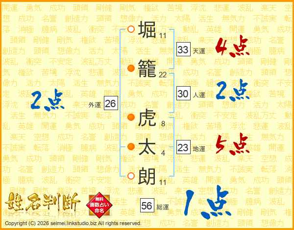 堀(11画)籠(22画) 虎(8画)太(4画)朗(11画)