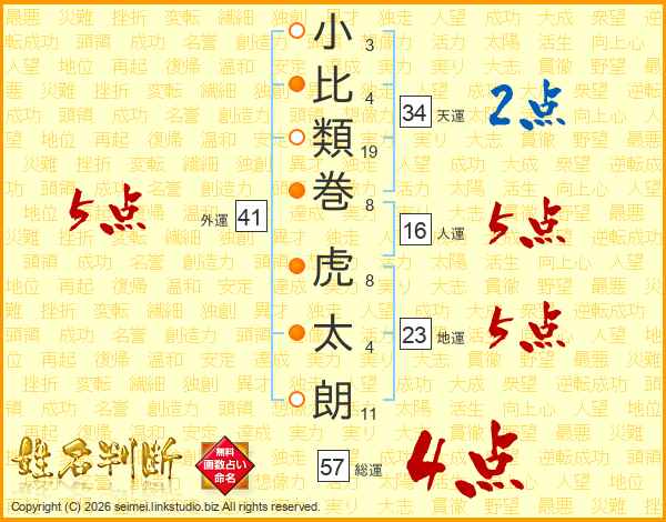 小(3画)比(4画)類(19画)巻(8画) 虎(8画)太(4画)朗(11画)