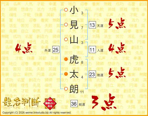 小(3画)見(7画)山(3画) 虎(8画)太(4画)朗(11画)