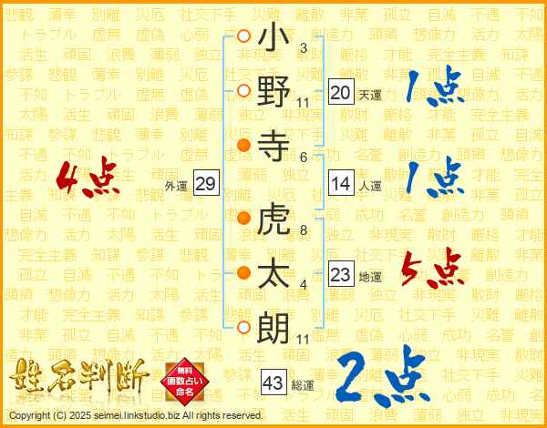 小(3画)野(11画)寺(6画) 虎(8画)太(4画)朗(11画)