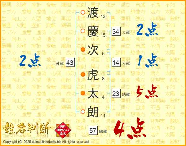 渡(13画)慶(15画)次(6画) 虎(8画)太(4画)朗(11画)