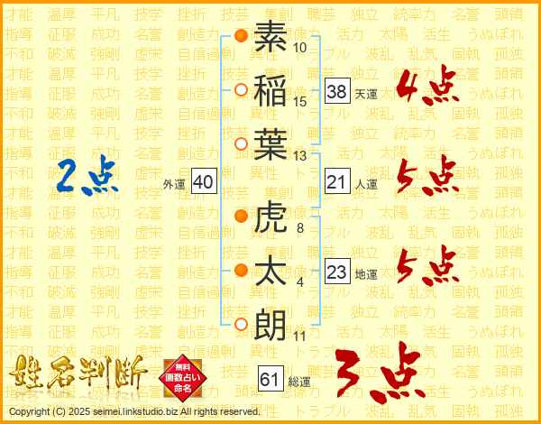 素(10画)稲(15画)葉(13画) 虎(8画)太(4画)朗(11画)