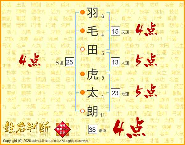 羽(6画)毛(4画)田(5画) 虎(8画)太(4画)朗(11画)