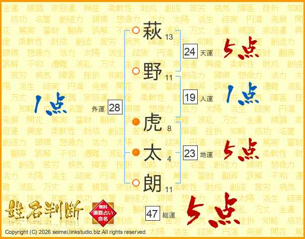 萩(13画)野(11画) 虎(8画)太(4画)朗(11画)