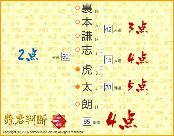 裏本謙志虎太朗さんの総運は65画の4点!