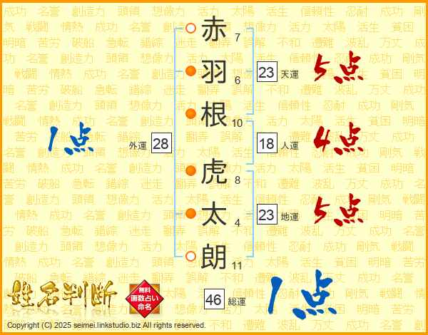 赤(7画)羽(6画)根(10画) 虎(8画)太(4画)朗(11画)